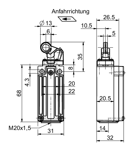 Actuator: Plastic roller lever with collar and stainless steel wire ring WHKD (insensitive to soiling)