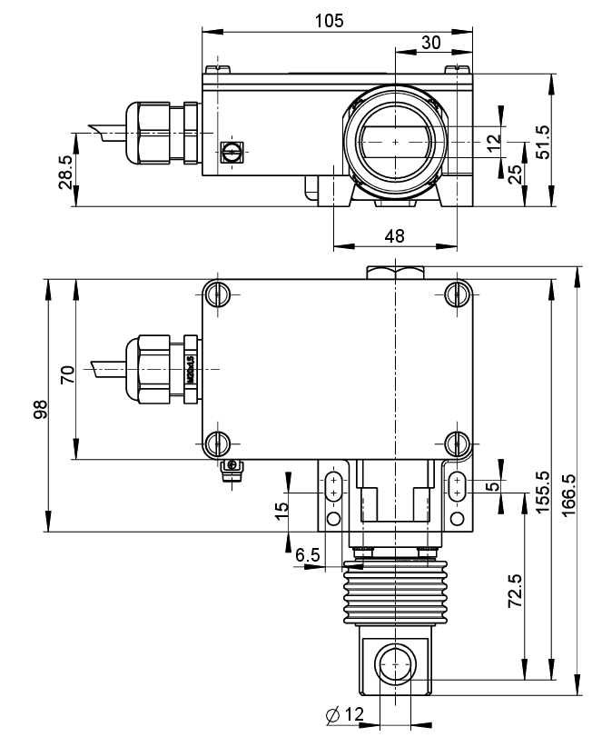 • Pull-wire unit made of stainless steel 1.4404, hard-coated housing, cover made of stainless steel 1.4404, screws A2