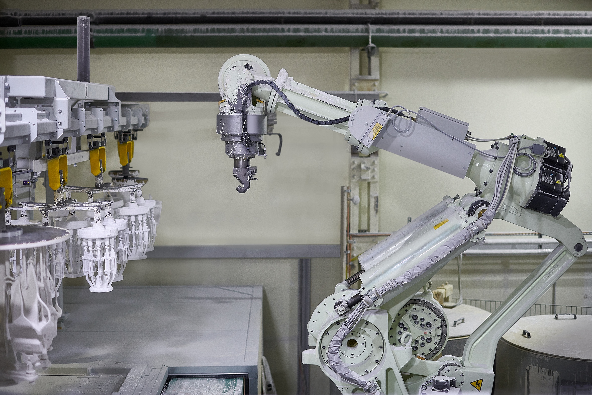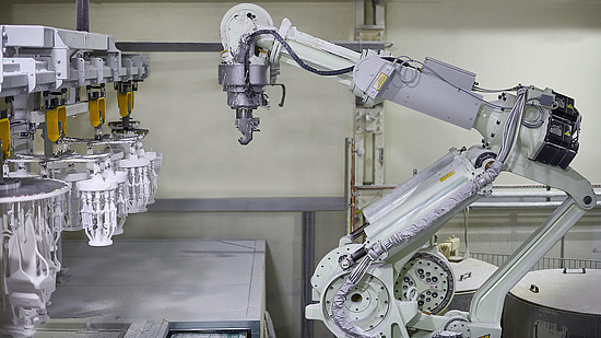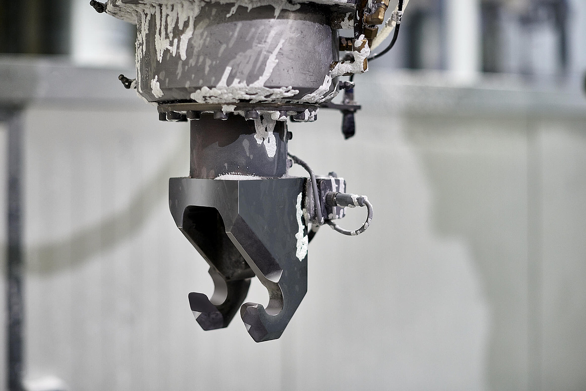 位于德国波鸿的唐卡斯特精密铸造厂(DPC)采用精密成型工艺,生产固定式燃气轮机与航空发动机叶片及导叶。该厂拥有500余名员工,具备完整的垂直制造体系,可自主生产模具。相关技术人员依托现有产能对生产设备进行优化,例如为全自动模具生产线的机器人夹持装置加装传感器。该传感器用于检测锁销是否完全伸出,在机器人将蜡模组浸入浆料池并摆动、确保陶瓷浆料覆盖所有倒勾部位前,对蜡模组进行可靠固定(见图 1)。
