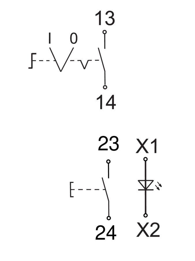 触点单元: AC-12: 6 A/400 VAC; AC-15: 2.5 A/400 VAC; DC-13: 1.25 A/250 VDC