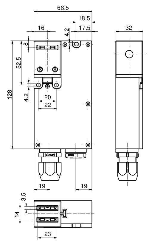 2 x M20 x 1.5; use only Ex approved and certified cable glands with min. degree of protection IP64 and admissible ambient temperature range of -20 °C … +95 °C