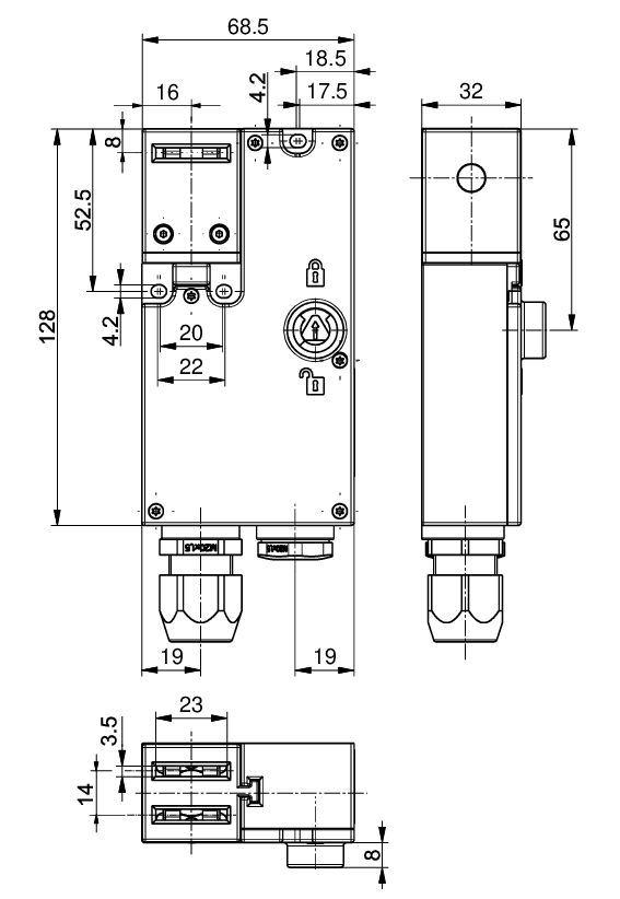 2 x M20 x 1.5; use only Ex approved and certified cable glands with min. degree of protection IP64 and admissible ambient temperature range of -20 °C … +95 °C