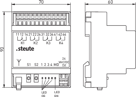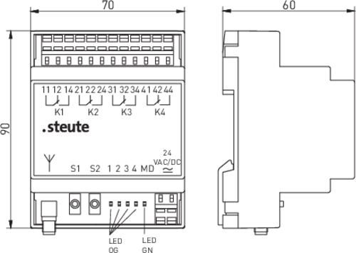 max. 24 ms (measured from the start of a radio telegram to the end of the relay contact bounce time, with 1 x repetition of the radio telegram due to transmission disturbance)